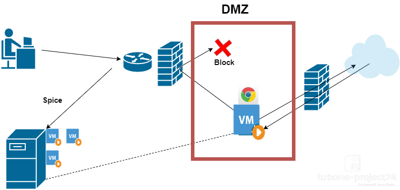 LAN内に入れないところ(DMZ)に仮想マシンを設置し、ウィンドウシステムとブラウザを入れる