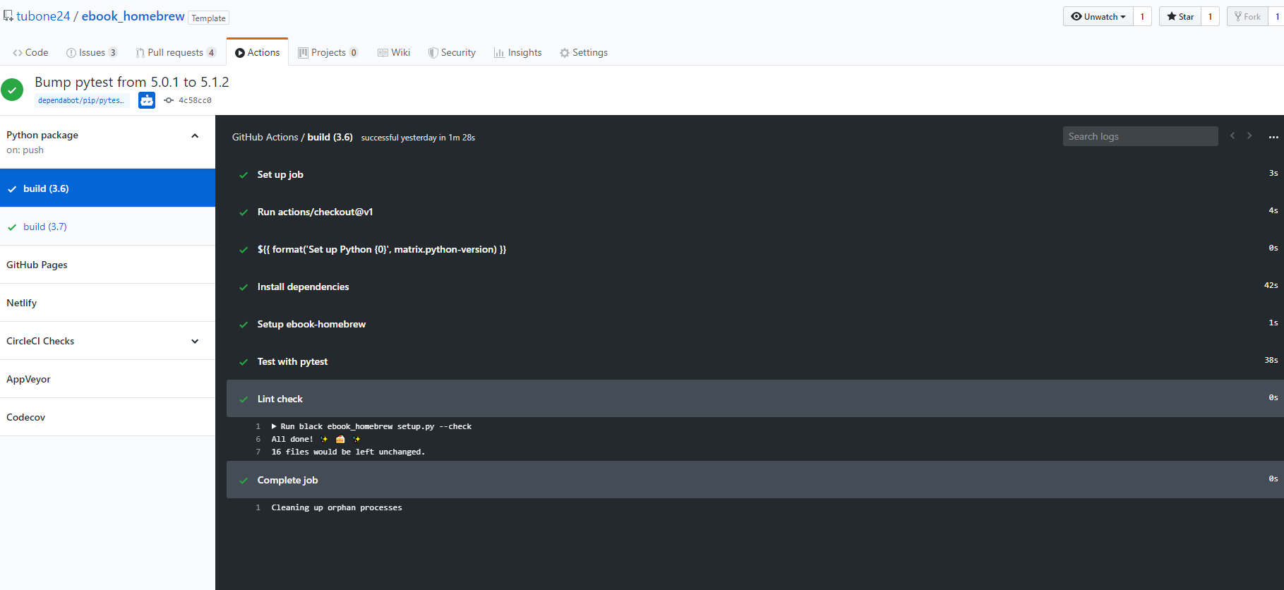 下記のようにPython環境の設定、のパッケージBuild、Pytestまでを設定します。
