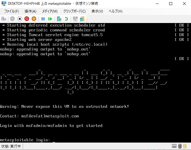 Metasploitableを起動します。