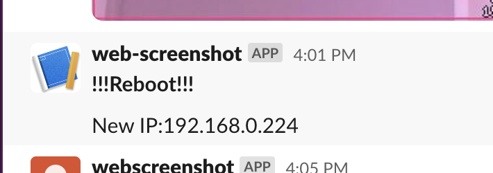 こんな感じで定期的に(1日1回)再起動が実施されIPアドレスの通知もSlackにしてくれます。