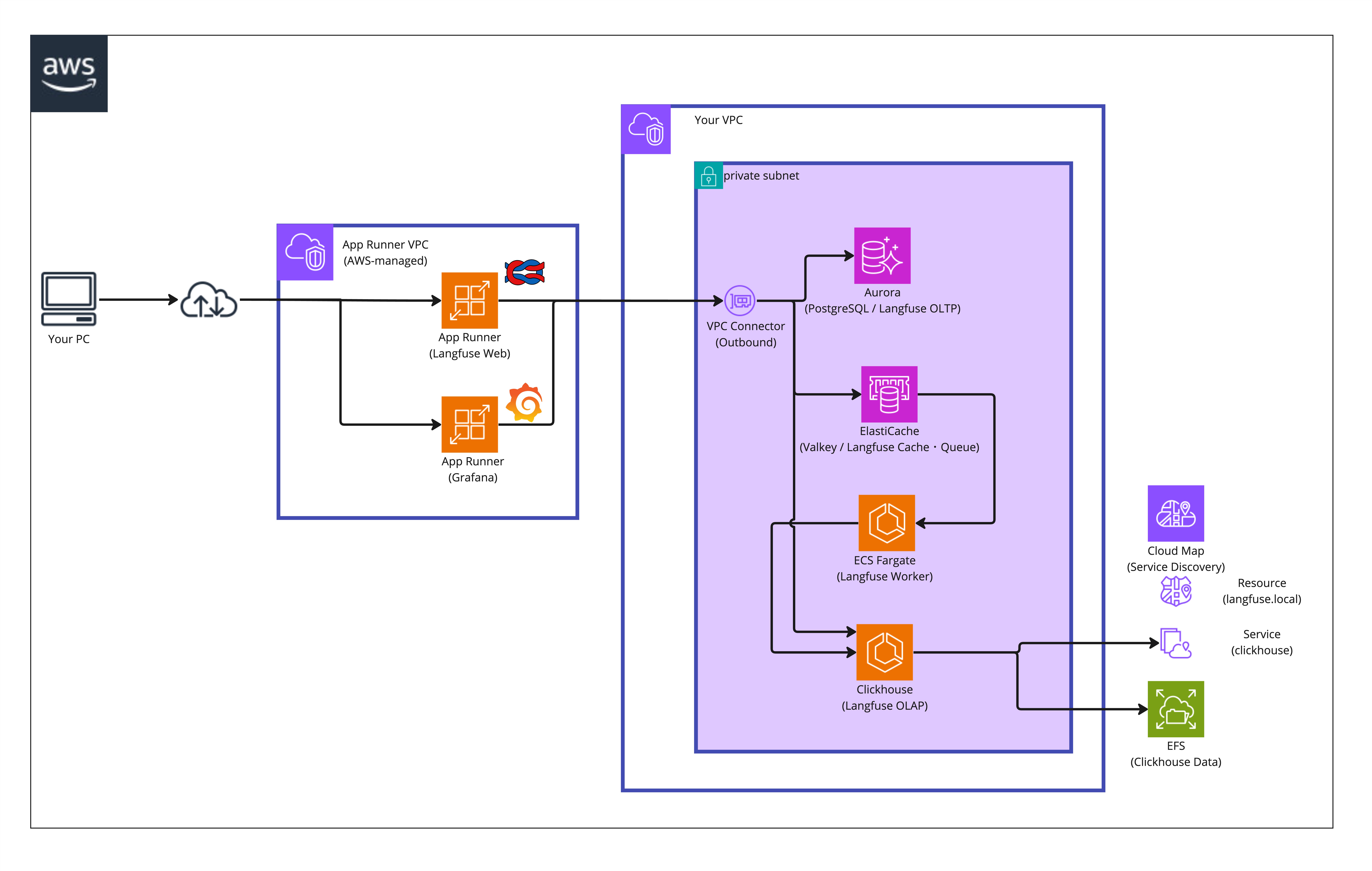 特徴として、Langfuse ServerはAWS App Runnerでデプロイしており、データベースはAmazon Aurora serverless v2で構築、それぞれのつなぎ込みはVPC Connectorを利用するというかなりシンプルな構成にしていました。